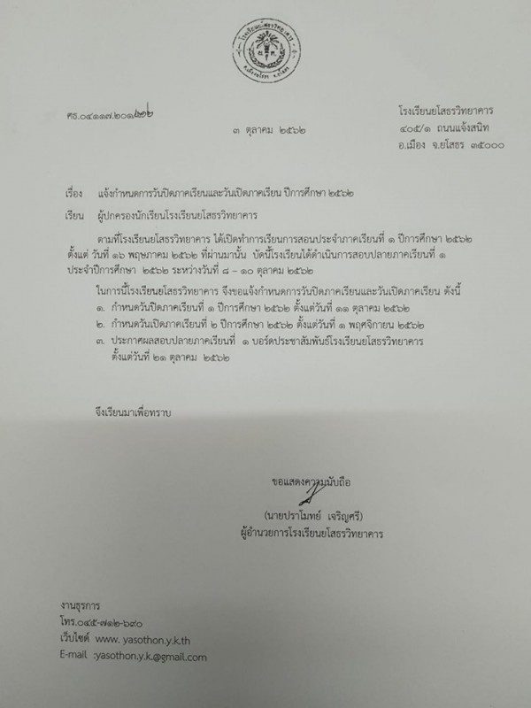 ประกาศโรงเรียนยโสธรวิทยาคารแจ้งกำหนดการวันปิดภาคเรียนและวันเปิดภาคเรียน ปีการศึกษา2562