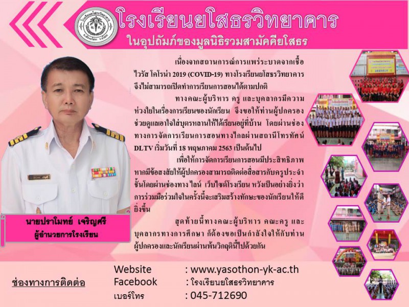 **ประชาสัมพันธ์เรื่องการจัดการเรียนการสอนทางไกลในสถานการณ์การแพร่ระบาดของเชื้อไวรัสโคโรนา 2019 (COVID-19) สำหรับผู้ปกครองนักเรียน ปีการศึกษา 2563 โรงเรียนยโสธรวิทยาคาร อำเภอเมือง จังหวัดยโสธร**