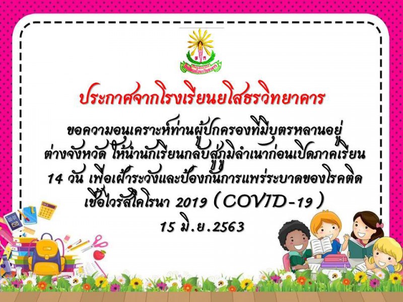 ขอความอนุเคราะห์ท่านผู้ปกครองที่มีบุตรหลานอยู่ต่างจังหวัด ให้นำนักเรียนกลับสู่ภูมิลำเนา