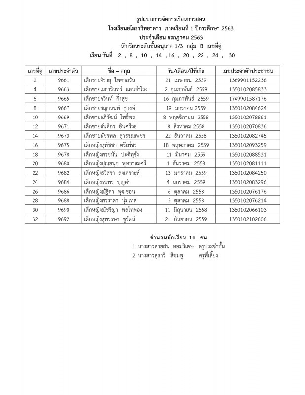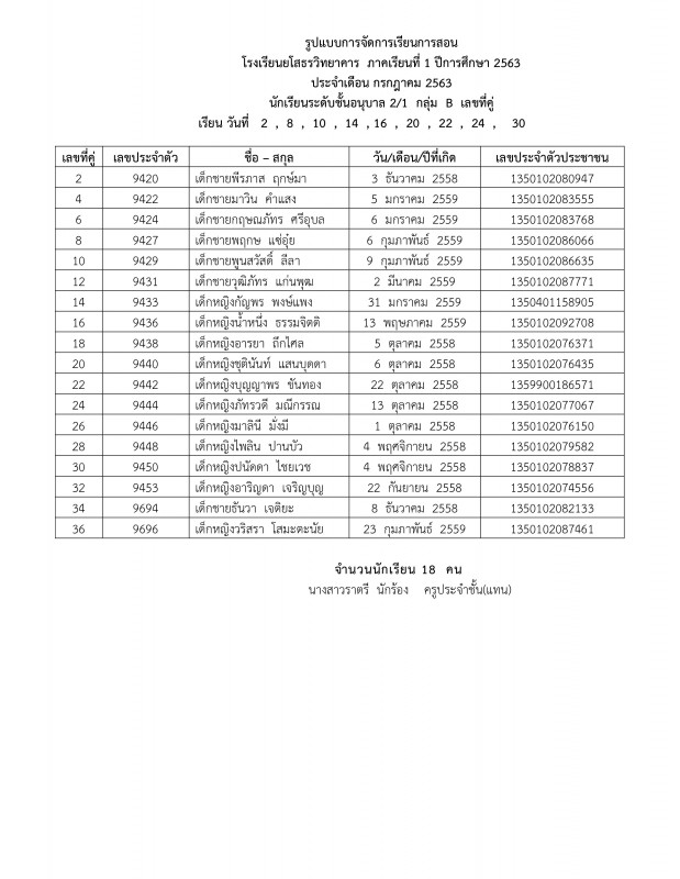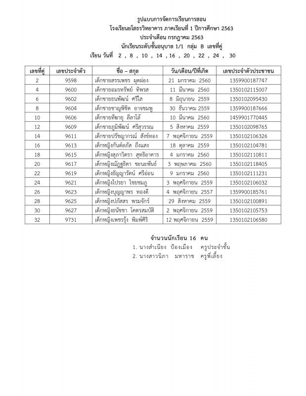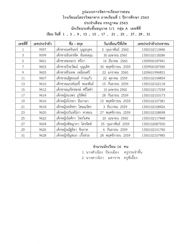 แนวทางการบริหารการจัดการเรียนการสอน โรงเรียนยโสธรวิทยาคาร ปีการศึกษา 2563 ระดับอนุบาล 1 - 3