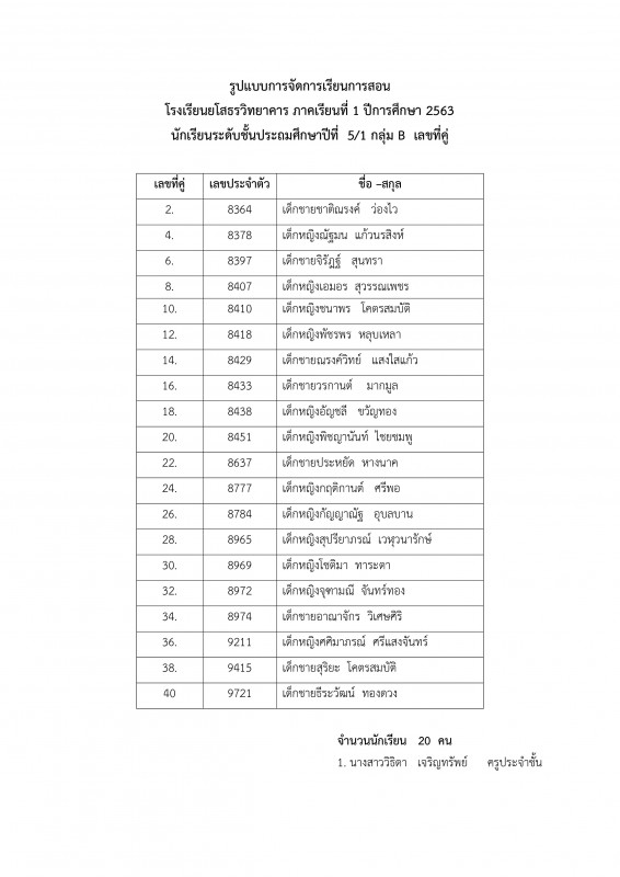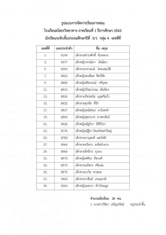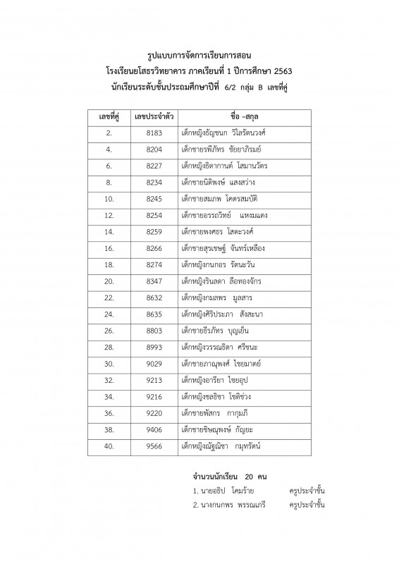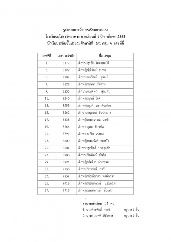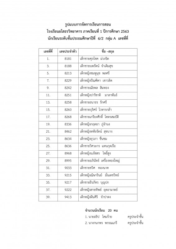แนวทางการบริหารการจัดการเรียนการสอน โรงเรียนยโสธรวิทยาคาร ปีการศึกษา 2563 ระดับชั้นประถมศึกษาปีที่ 1 - 6 ** รายชื่อนักเรียนระดับชั้น ป.1 - 6 1 ห้องเรียนแบ่งเป็น 2 กลุ่ม ** กลุ่ม A เลขที่ คี่ ** กลุ่ม B เลขที่ คู่ และตารางเรียนประจำเดือนกรกฏาคม