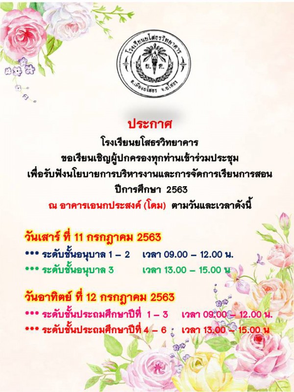 *** ประกาศโรงเรียนยโสธรวิทยาคาร ขอเรียนเชิญผู้ปกครองทุกท่านเข้าร่วมประชุม เพื่อรับฟังนโยบายการบริหารงานและการจัดการเรียนการสอน ปีการศึกษา 2563
