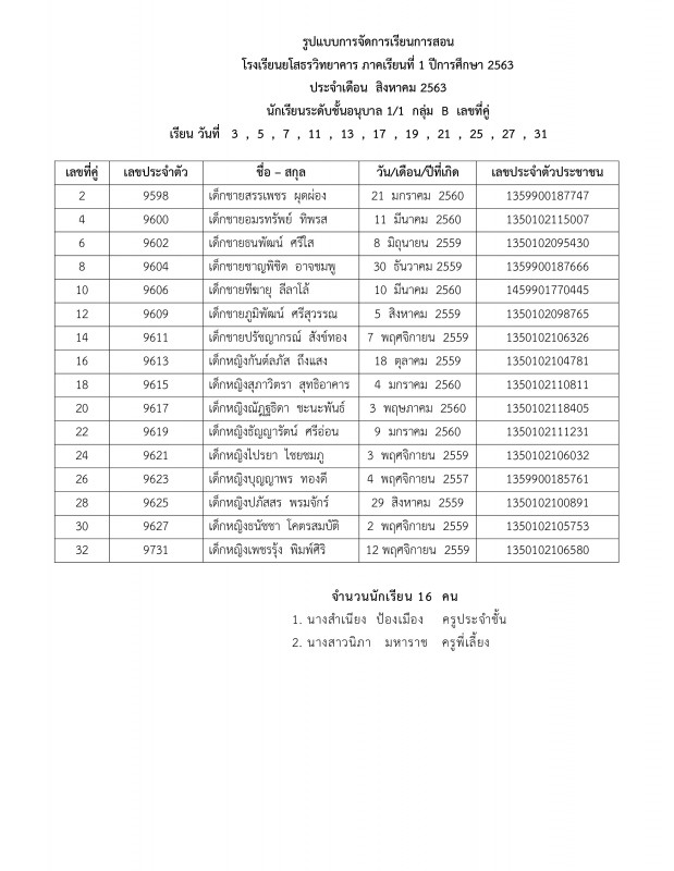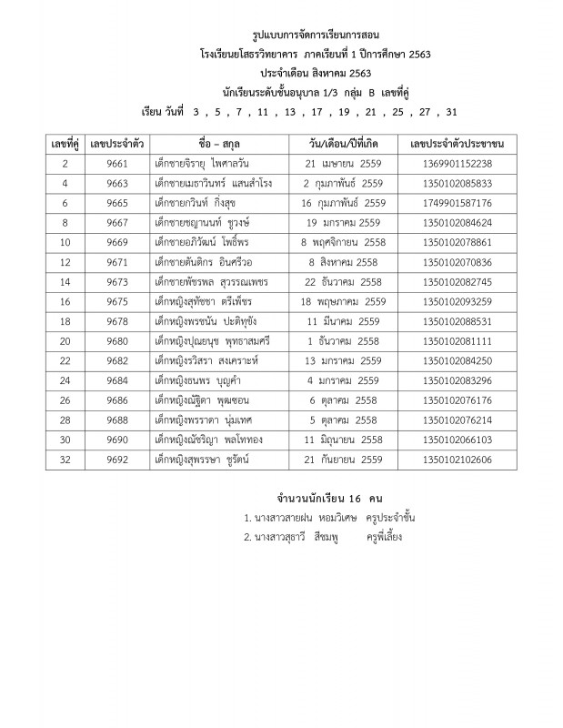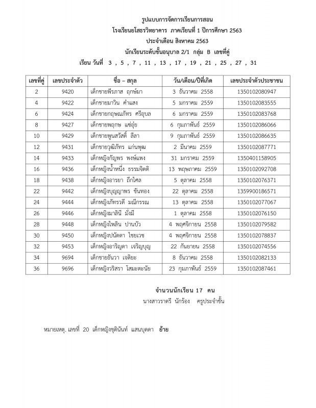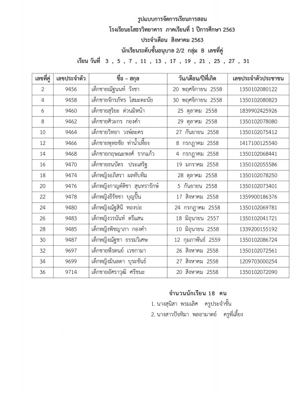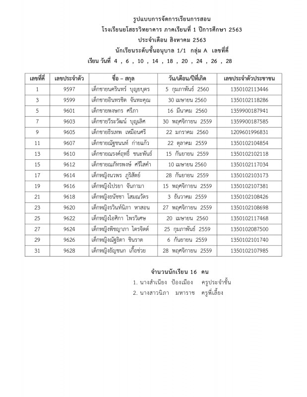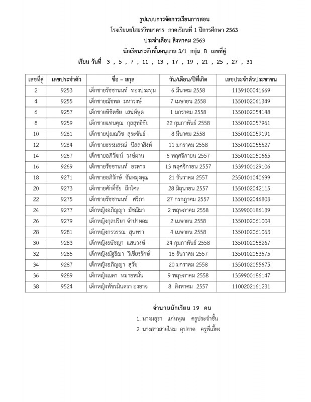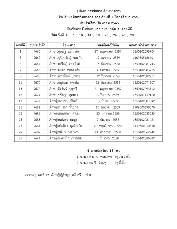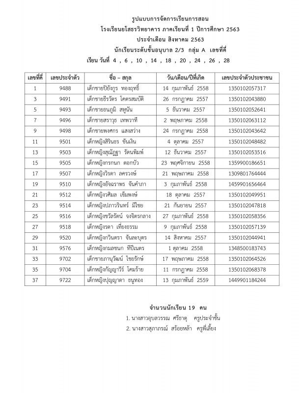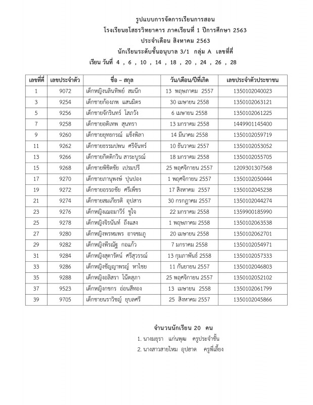แจ้งตารางเรียนประจำเดือนสิงหาคม 2563 ระดับชั้นอนุบาล 1 - อนุบาล 3