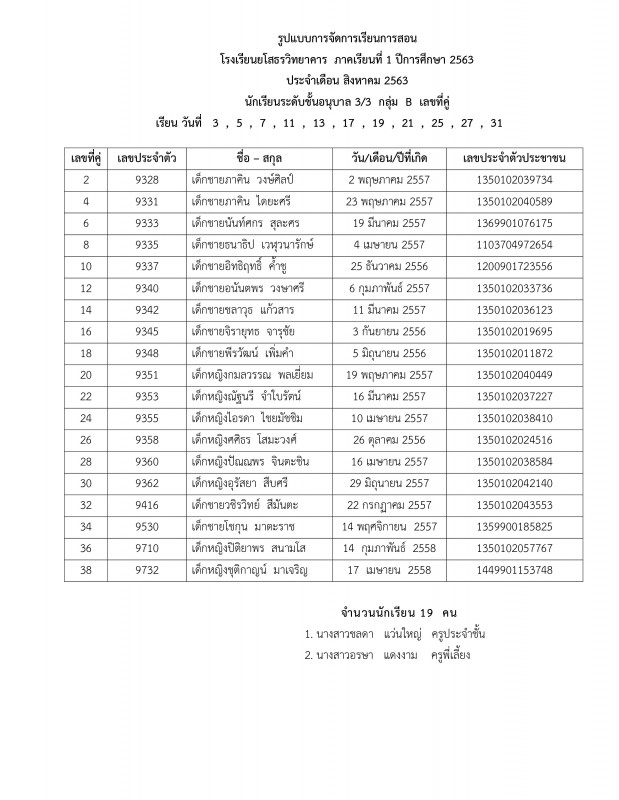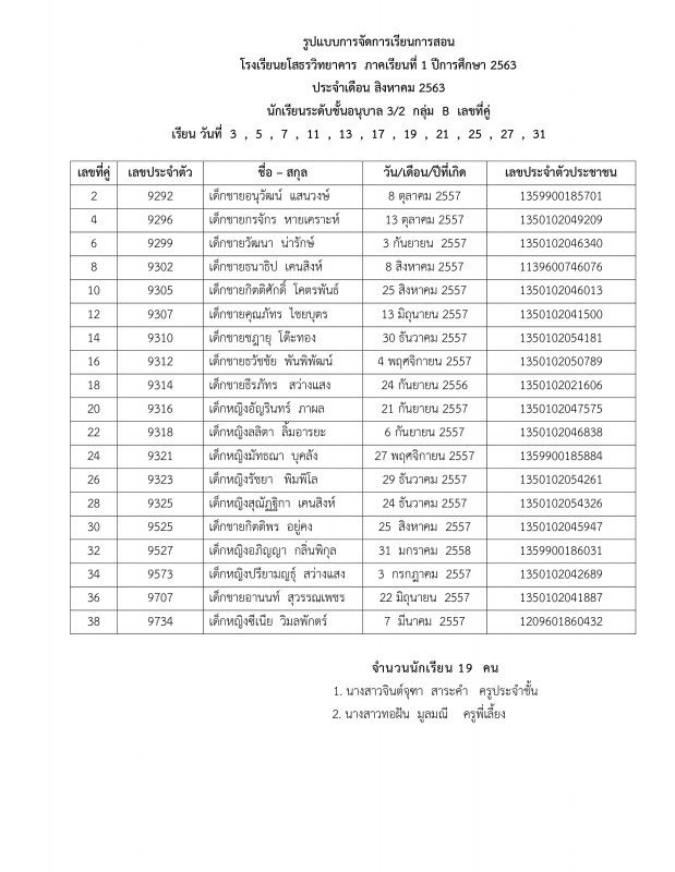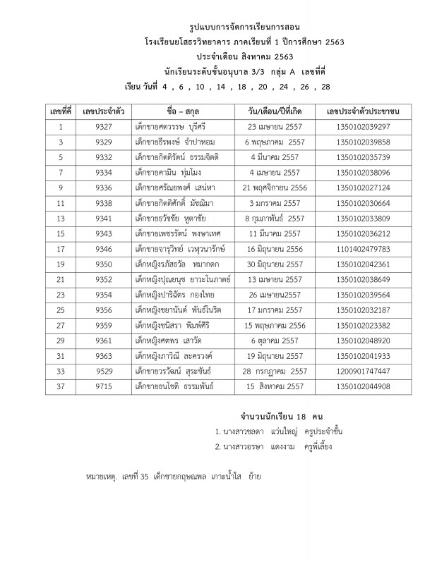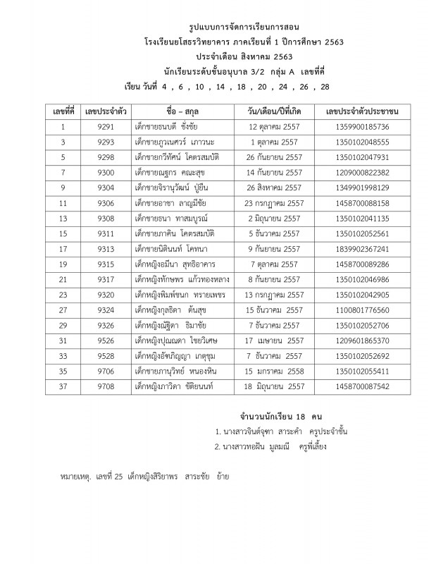 แจ้งตารางเรียนประจำเดือนสิงหาคม 2563 ระดับชั้นอนุบาล 1 - อนุบาล 3