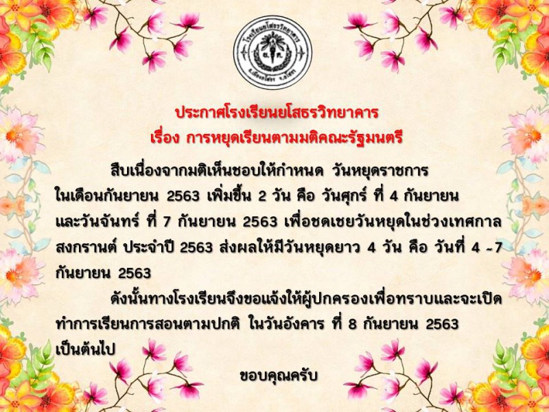 ประกาศโรงเรียนยโสธรวิทยาคาร แจ้งการหยุดเรียนตามมติคณะรัฐมนตรี