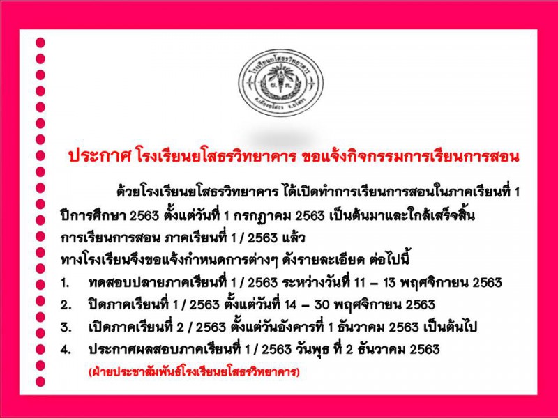 ประกาศโรงเรียนยโสธรวิทยาคาร ขอแจ้งกิจกรรมการเรียนการสอน ดังรายละเอียดต่อไปนี้