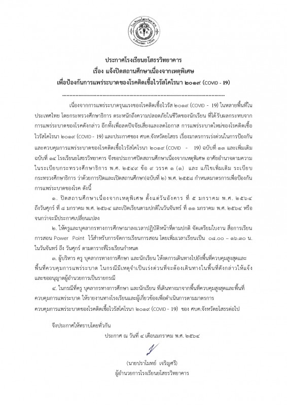 ****ประกาศโรงเรียนยโสธรวิทยาคาร**** เรื่อง แจ้งปิดสถานศึกษาเนื่องจากเหตุพิเศษ เพื่อป้องกันการแพร่ระบาดของโรคติดเชื้อไวรัสโคโรนา 2019 (COVID - 19)