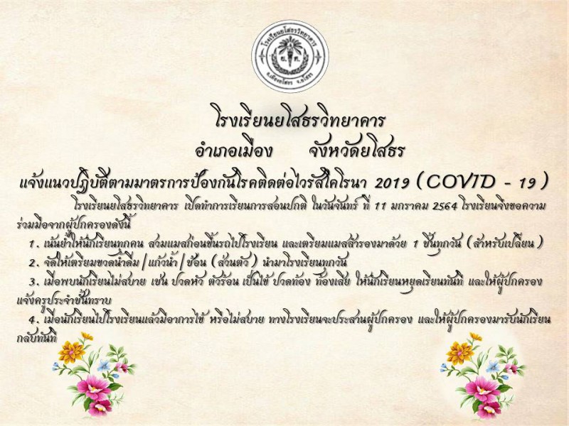 แจ้งแนวปฎิบัติตามมาตรการป้องกันโรคติดต่อไวรัสโคโรนา 2019 (COVID - 19) โรงเรียนยโสธรวิทยาคาร เปิดทำการเรียนการสอนปกติ ในวันจันทร์ ที่ 11 มกราคม 2564 โรงเรียนจึงขอความร่วมมือจากผู้ปกครองดังนี้