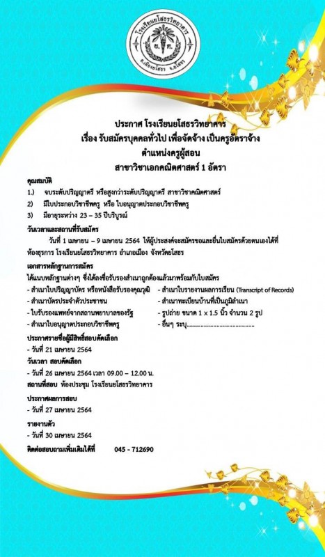 ประกาศ โรงเรียนยโสธรวิทยาคาร รับสมัครครูอัตราจ้าง 1 อัตรา สาขาวิชาเอกคณิตศาสตร์