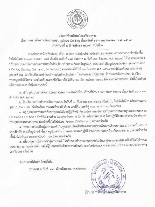 ประกาศ งดการจัดการเรียนการสอน รูปแบบ On Site ตั้งแต่วันที่ 16 – 31 สิงหาคม พ.ศ. 2564