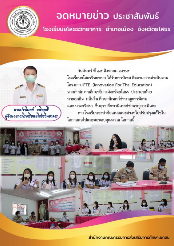 โรงเรียนยโสธรวิทยาคาร ได้รับการนิเทศ ติดตาม การดำเนินงานโครงการ IFTE (Innovation For Thai Education) จากสำนักงานศึกษาธิการจังหวัดยโสธร