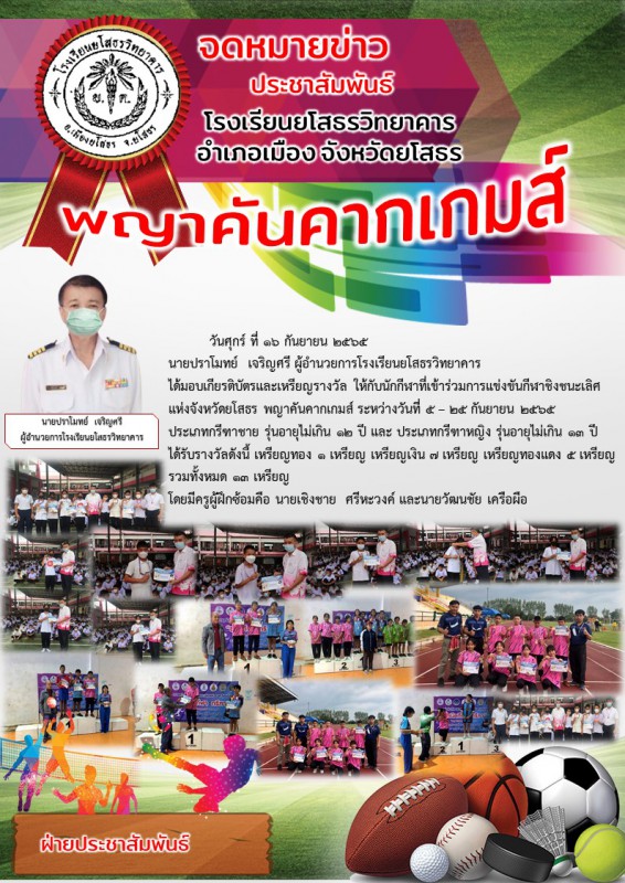 ได้มอบเกียรติบัตรและเหรียญรางวัล ให้กับนักกีฬาที่เข้าร่วมการแข่งขันกีฬาชิงชนะเลิศแห่งจังหวัดยโสธร พญาคันคากเกมส์ ระหว่างวันที่ ๕ – ๒๕ กันยายน ๒๕๖๕ ประเภทกรีฑาชาย รุ่นอายุไม่เกิน ๑๒ ปี และ ประเภทกรีฑาหญิง รุ่นอายุไม่เกิน ๑๓ ปี
