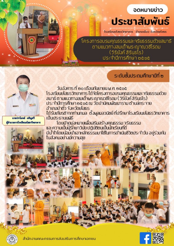 ได้จัดโครงการอบรมคุณธรรมและจริยธรรมด้วยสมาธิ ตามแนวทางสมเด็จพระญาณวชิโรดม (วิริยังค์ สิรินธโร) ประจำปีการศึกษา ๒๕๖๕ ณ วัดป่านิคมพัฒนาราม ตำบลกระจาย อำเภอป่าติ้ว จังหวัดยโสธร #ระดับชั้นประถมศึกษาปีที่๒