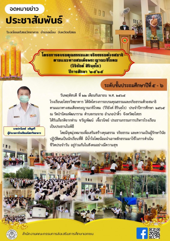 โรงเรียนยโสธรวิทยาคาร ได้จัดโครงการอบรมคุณธรรมและจริยธรรมด้วยสมาธิ ตามแนวทางสมเด็จพระญาณวชิโรดม (วิริยังค์ สิรินธโร) ประจำปีการศึกษา ๒๕๖๕ ณ วัดป่านิคมพัฒนาราม ตำบลกระจาย อำเภอป่าติ้ว จังหวัดยโสธร