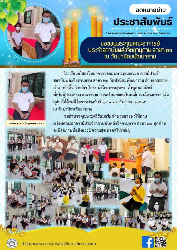 โรงเรียนยโสธรวิทยาคารขอขอบพระคุณคณะอาจารย์ประจำสถาบันพลังจิตตานุภาพ สาขา ๖๑ วัดป่านิคมพัฒนาราม ตำบลกระจาย อำเภอป่าติ้ว จังหวัดยโสธร