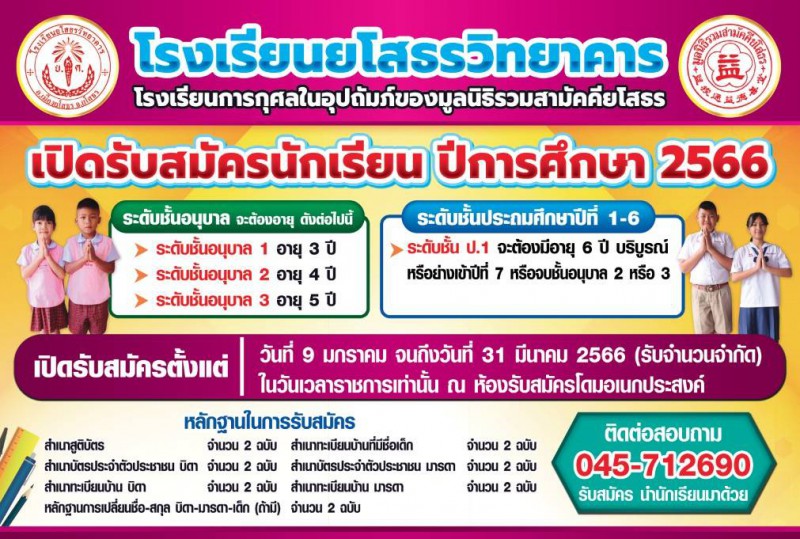 โรงเรียนยโสธรวิทยาคาร เปิดรับสมัครนักเรียน ปีการศึกษา 2566 ตั้งแต่วันที่ 9 มกราคม จนถึงวันที่ 31 มีนาคม 2566 (รับจำนวนจำกัด) ในวันเวลาราชการเท่านั้น ณ ห้องรับสมัครโรงเรียนยโสธรวิทยาคาร |