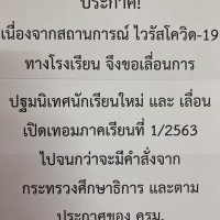 ประกาศเนื่องจากสถานการณ์ ไวรัสโควิด-19 ทางโรงเรียนจึงขอเลื่อนการปฐมนิเทศนักเรียนใหม่ และ เลื่อนเปิดเทอมภาคเรียนที่ 1/2563 ไปจนกว่าจะมีคำสั่งจากกระทรวงศึกษาธิการ และตามประกาศของ ครม.