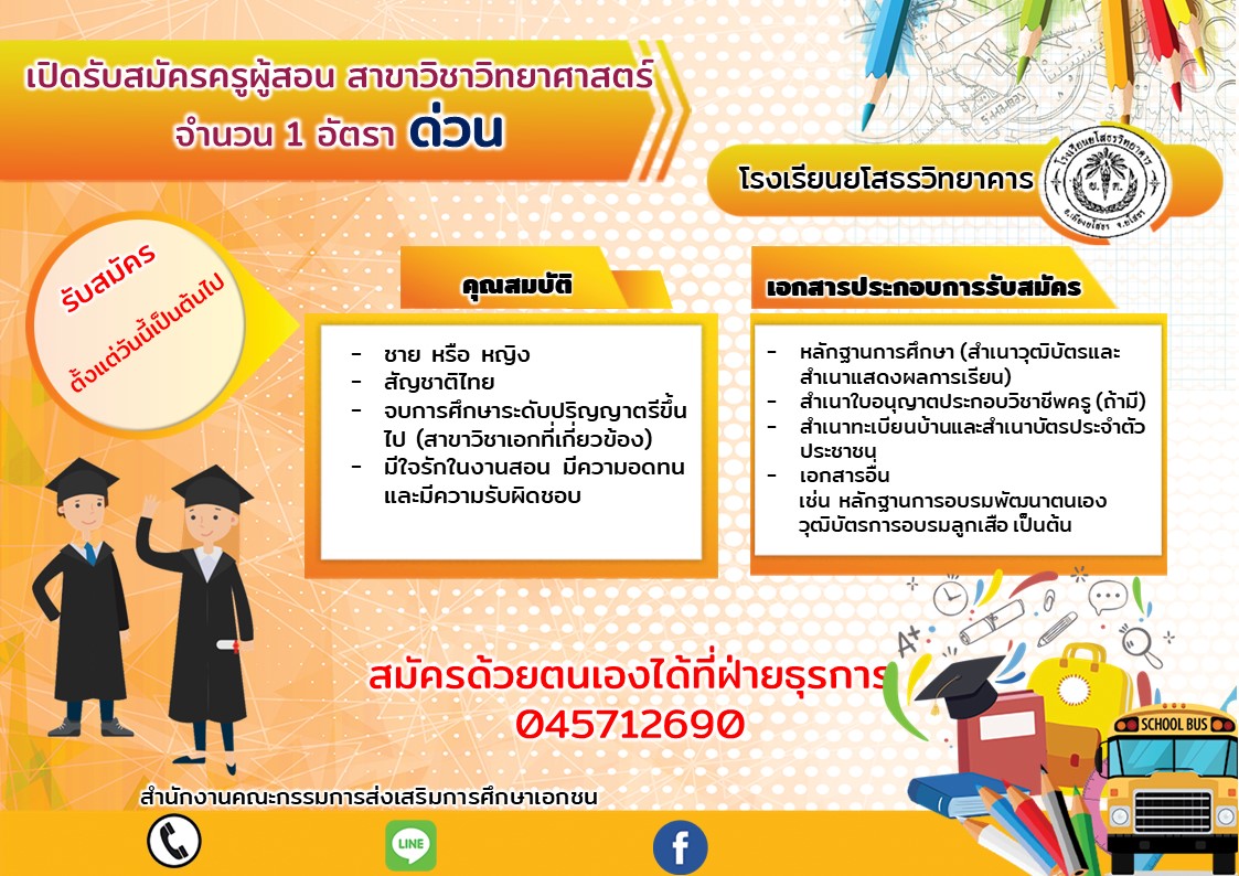 เปิดรับสมัครครูผู้สอน สาขาวิชาวิทยาศาสตร์ จำนวน 1 อัตรา ด่วน