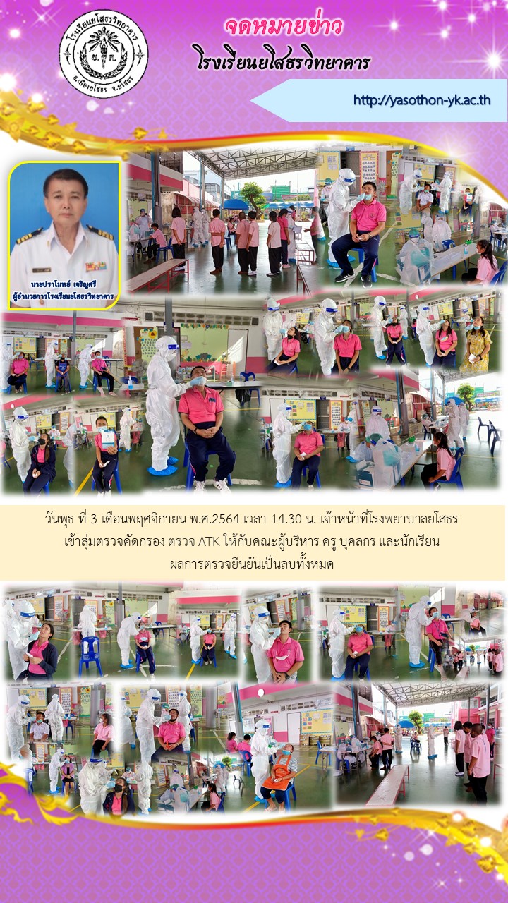 วันพุธ ที่ 3 เดือนพฤศจิกายน พ.ศ.2564 เวลา 14.30 น. เจ้าหน้าที่โรงพยาบาลยโสธร เข้าสุ่มตรวจคัดกรอง ตรวจ ATK ให้กับคณะผู้บริหาร ครู บุคลกร และนักเรียน