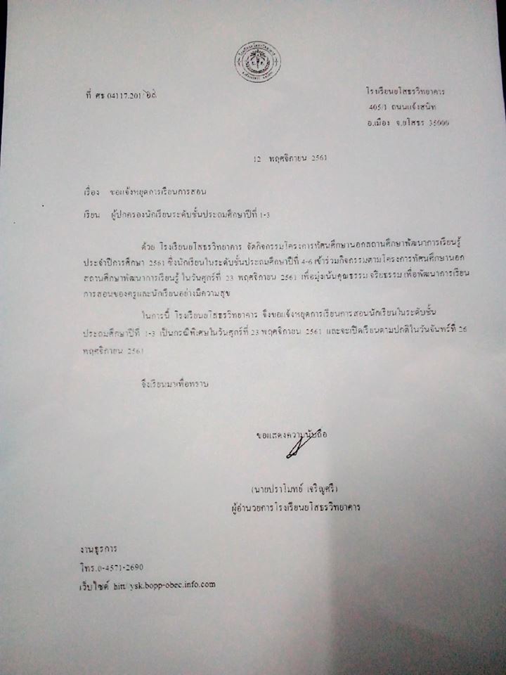 ในการนี้ โรงเรียนยโสธรวิทยาคาร จึงขอแจ้งหยุดการเรียนการสอนนักเรียนชั้นประถมศึกษาปีที่ 1 - 3 เป็นกรณีพิเศษ ในวันศุกร์ที่ 23 พฤศจิกายน 2561 และจะเปิดเรียนตามปกติในวันจันทร์ที่ 26 พฤศจิกายน 2561