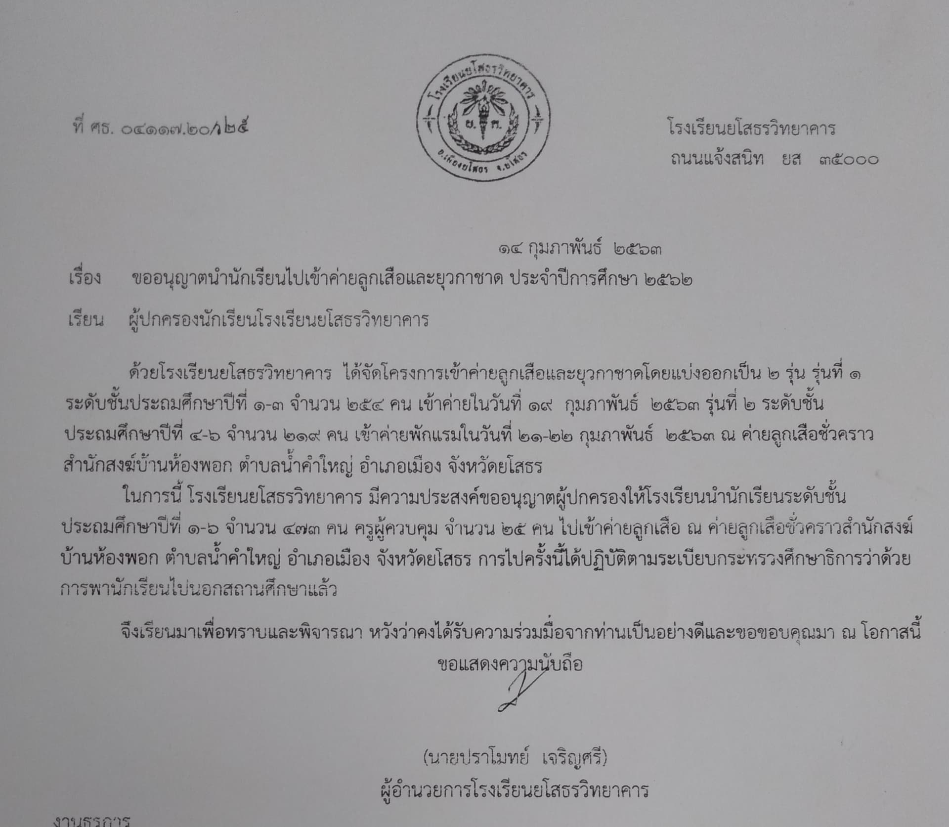 **โรงเรียนยโสธรวิทยาคาร ได้จัดโครงการเข้าค่ายลูกเสือและยุวกาชาด ประจำปีการศึกษา 2562 ณ ค่ายลูกเสือชั่วคราว สำนักสงฆ์บ้านห้องพอก ตำบลน้ำคำใหญ่