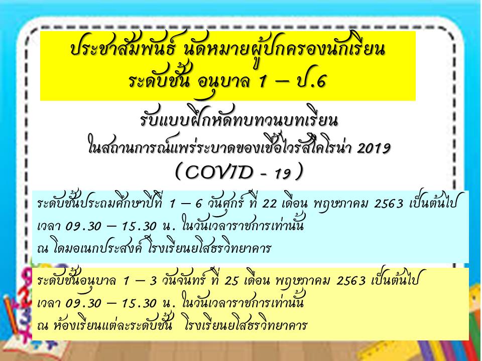 ประชาสัมพันธ์ นัดหมายผู้ปกครองนักเรียน ระดับชั้น อนุบาล 1 – ป.6 รับแบบฝึกหัดทบทวนบทเรียนในสถานการณ์แพร่ระบาดของเชื้อไวรัสโคโรน่า 2019 (COVID - 19) ***ระดับชั้นประถมศึกษาปีที่ 1 – 6 วันศุกร์ ที่ 22 เดือน พฤษภาคม 2563 เป็นต้นไป เวลา 09.30 – 15.30 น. ในวันเวลาราชการเท่านั้น ณ โดมอเนกประสงค์ โรงเรียนยโสธรวิทยาคาร ***ระดับชั้นอนุบาล 1 – 3 วันจันทร์ ที่ 25 เดือน พฤษภาคม 2563 เป็นต้นไป เวลา 09.30 – 15.30 น. ในวันเวลาราชการเท่านั้น ณ ห้องเรียนแต่ละระดับชั้น โรงเรียนยโสธรวิทยาคาร |