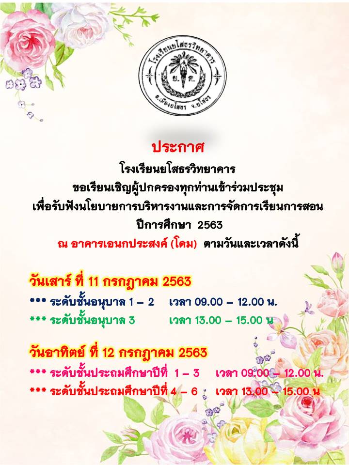 ประกาศโรงเรียนยโสธรวิทยาคาร ขอเรียนเชิญผู้ปกครองทุกท่านเข้าร่วมประชุม เพื่อรับฟังนโยบายการบริหารงานแ
