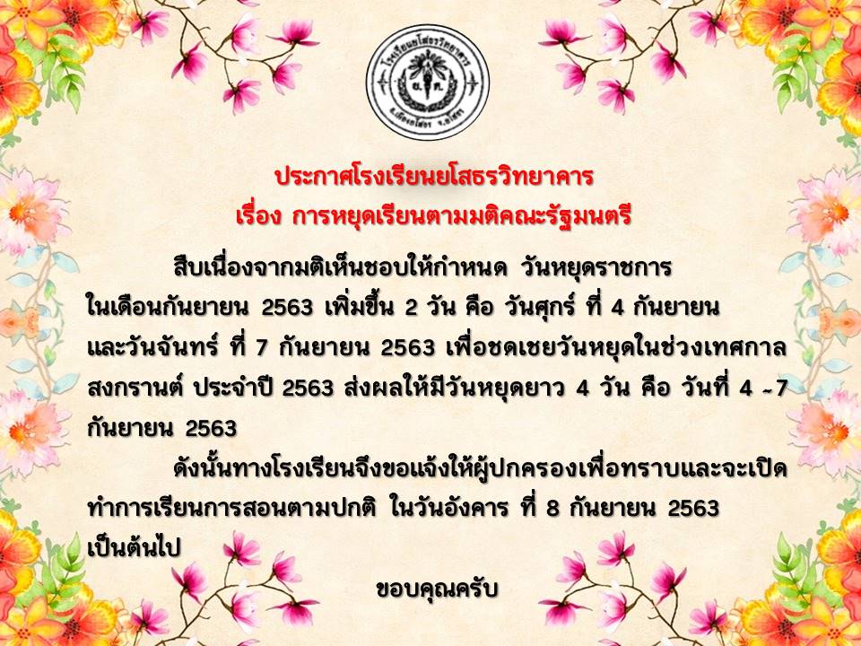 *** ประกาศโรงเรียนยโสธรวิทยาคาร แจ้งการหยุดเรียนตามมติคณะรัฐมนตรี ***